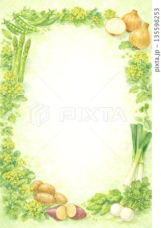 春野菜の水彩フレーム 菜の花とアスパラの背景 A4縦