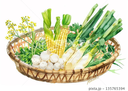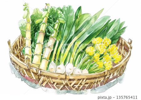 水彩風 早春の山菜 竹ざるの上のうど