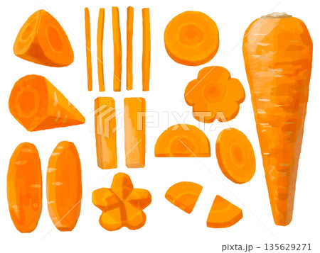 人参の手描き水彩セット輪切り半月切りみじん切り銀杏切り拍子木切りいろんなカット