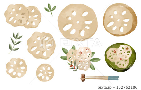 輪切りにされた新鮮な蓮根の手描き水彩イラスト