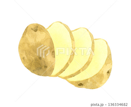 カットしたじゃがいも(スライス・輪切り) 野菜の手描き水彩イラスト素材