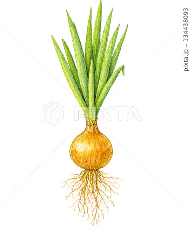 水彩で描いた収穫まじかの新玉ねぎのイラスト【手描き】白バック 透過背景 コピースペースあり