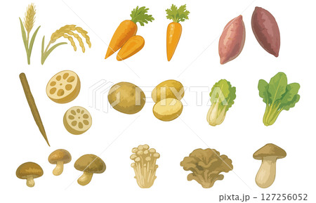 秋の旬野菜イラストセット|さつまいも・きのこ・れんこん・稲など