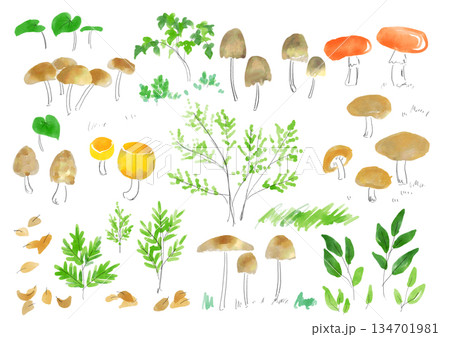 水彩ボタニカル素材:きのこ&秋の葉クリップアート