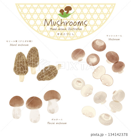 世界のきのこづくしベクターセット<モリーユ茸・マッシュルーム・ポルチーニ茸>