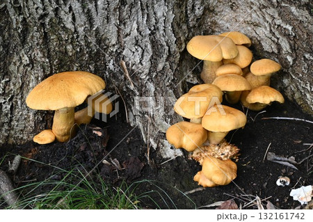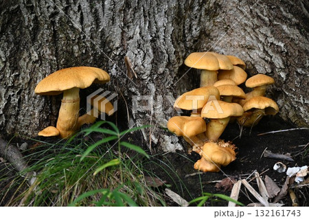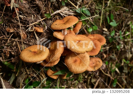 湿潤な林内落葉土壌にナラタケモドキ茸が群れる(自然環境下ストロボマクロ撮影)