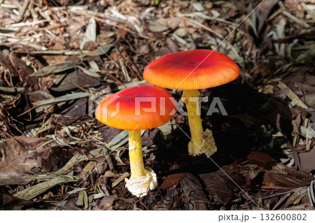タマゴタケ/オレンジ色の2本のキノコ/テングタケ科・八千穂高原・8月