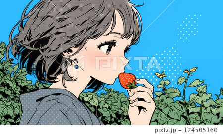 《AI画像》笑顔でいちごを持つ女性 いちご狩りイメージ