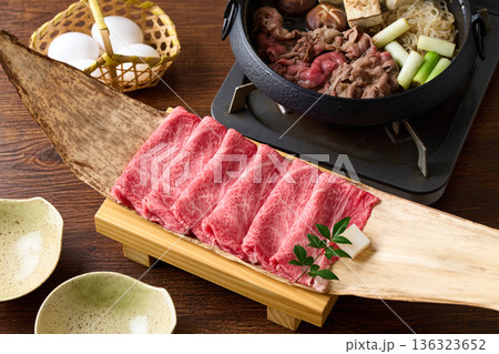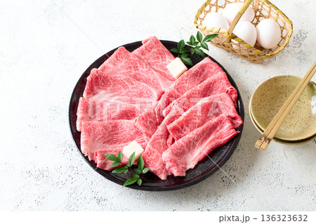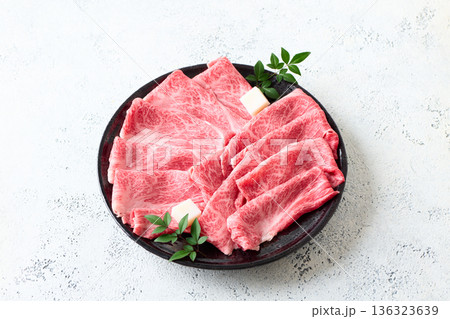 白背景に黒毛和牛のロース肉(すき焼き用)