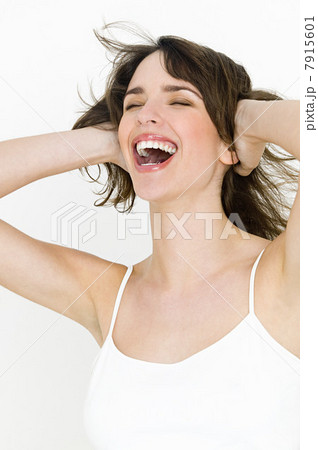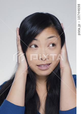 Studio shot portrait of teenage girl with fingers in ears, head and shoulders
