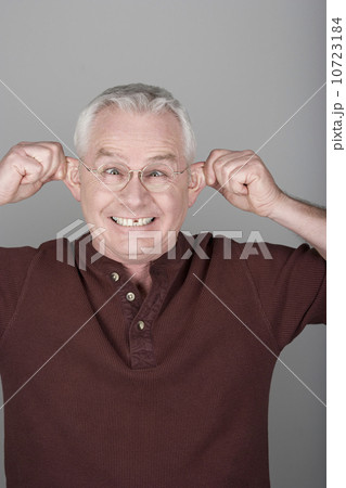 Studio shot portrait of senior man pulling his ears, head and shoulders