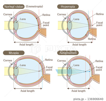 目の構造と屈折異常(正常・近視・遠視・乱視)の説明図