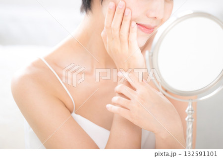 鏡を見る肌のスキンケアを確認する美人な黒髪のショートカットの女性 美容やビューティー、美肌のイメージ