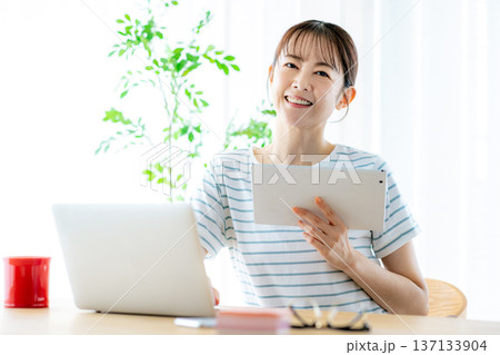 リビングでテレワークするミドルの女性