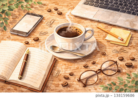 手描き水彩タッチで描かれたノートパソコン作業の俯瞰イラスト