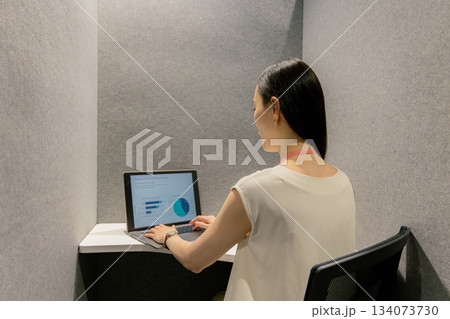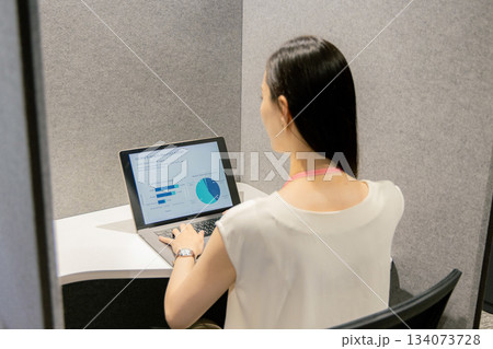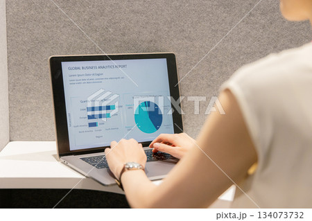 窓際のデスクに置かれたノートパソコンとビジネスデータ