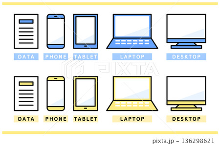 紙と各種デバイスで構成された業務データ表示の2色カラーバリエーションセットのイラスト
