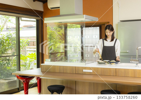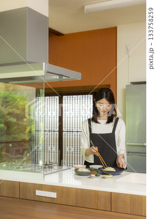 キッチンで食事を用意する女性
