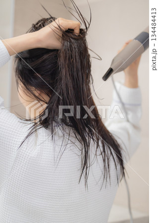 ドライヤーで髪の毛を乾かす若い女性