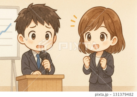 緊張しながらプレゼンするちびキャラ社員と励ます同僚