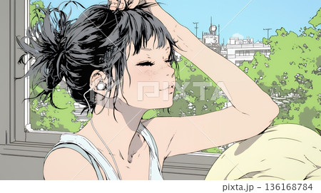 朝の光の中で目覚まし時計を止める寝起きの女子高生 眠い朝のルーティン