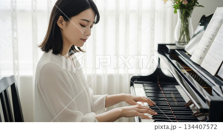 望遠レンズで校舎外から窓越しに撮影した、音楽室でピアノを弾く女子高校生