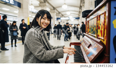 ストリートピアノ 街角ピアノ ピアノを弾く女性