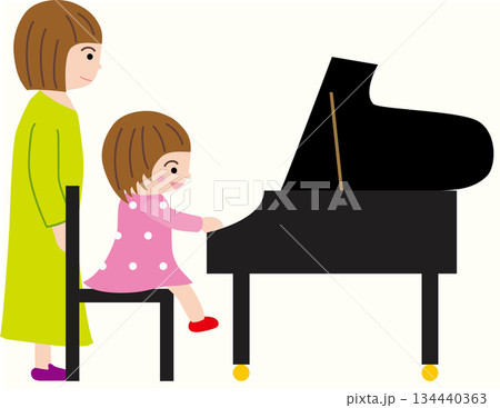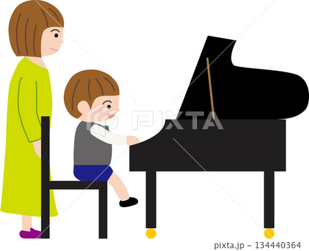 母親と子どもが一緒にピアノを弾く水彩風イラスト