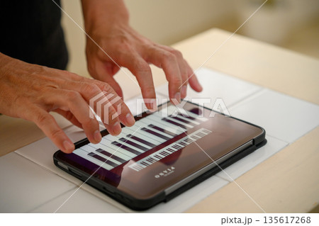 路上ライブ ストリートライブ キーボードを弾く男性の手元 顔無し