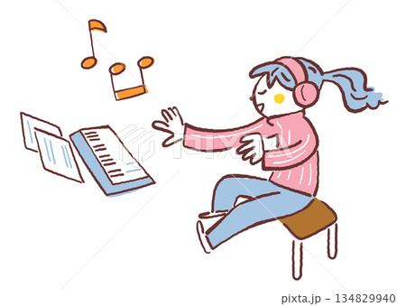 イヤーマフをしてピアノを楽しむ女の子、インクルーシブ教育の小学生、イラスト