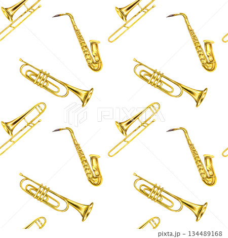 Watercolor musical classical brass trumpet, trombone and saxophone seamless pattern on isolated background. Hand painted jazz metallic golden instruments illustration for your design, textile, print.