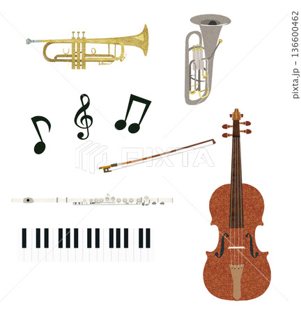 ピアノやバイオリン・トランペットなどの楽器のセット