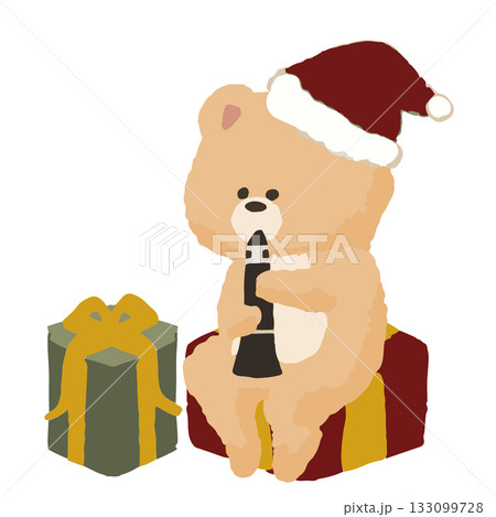 冬の音楽会でオーボエを演奏するクマ|サンタ帽のかわいい動物イラスト
