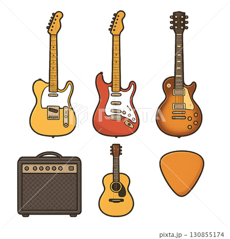 かわいいギターイラスト6種セット|アコギ・エレキ・ベース・アンプ・ピック