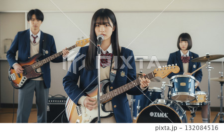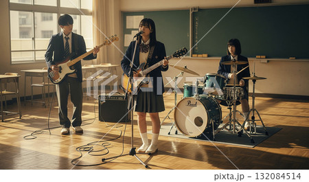 演奏する男女、(フルート、トロンボーン、アコースティックギター、エレキギター、サックス)