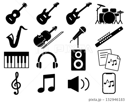 バンドの楽器アイコンセット(マイク,ギター,ベース,ドラム,キーボード)