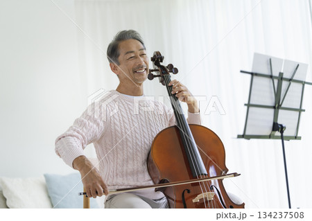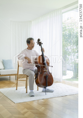 カメラ目線で笑顔のチェロを持ったシニア男性