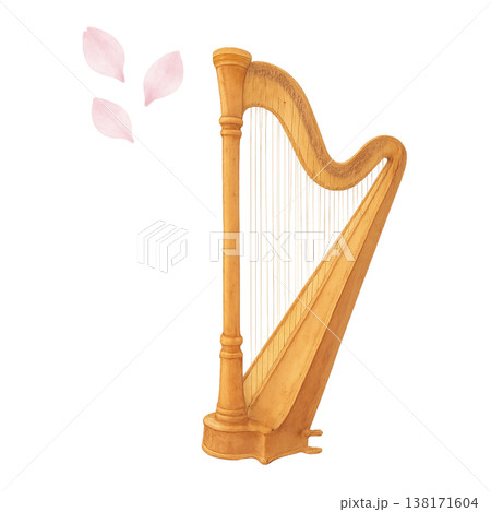 ハープと桜のシンプル素材 音楽と春の優雅なイメージ 白背景