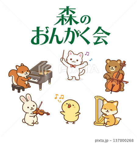 森の音楽会のイラスト(ネコ・リス・クマ・キツネ・ウサギ・ひよこ)|キッズ・子供向け・発表会