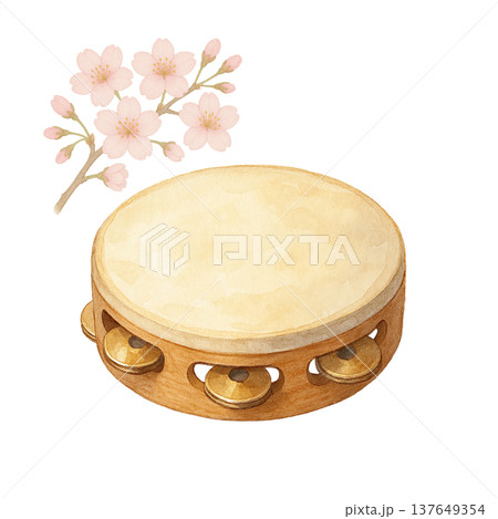 桜の花とタンバリンの水彩イラスト 音楽リズム素材