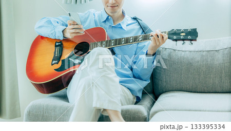 オンラインで楽器(ウクレレ)のレッスンを受ける男性