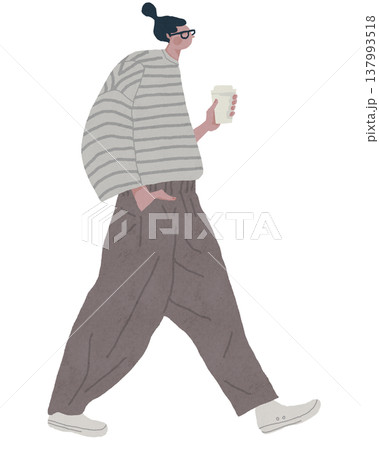 コーヒーを片手に歩くストライプのシャツを着た女性