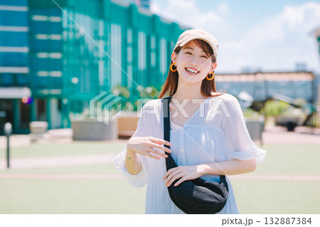 屋外で音楽を聴きながらアイスコーヒーを飲む女性