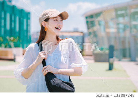 夏のUVケア、屋外でスキンケアをする50代のマダム