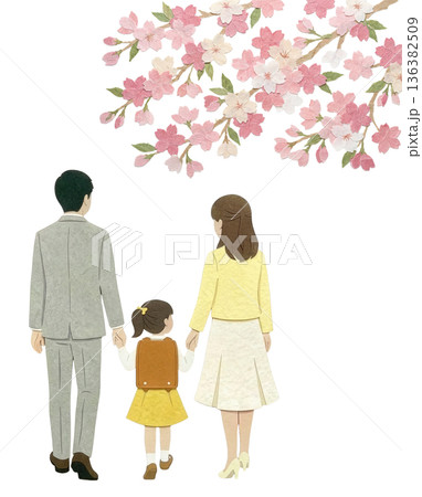桜の枝の下を歩く家族の後ろ姿 和紙切り絵イラスト