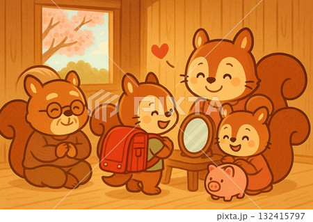 動物キャラ はじめての登校日 リスの家族 Generative AI