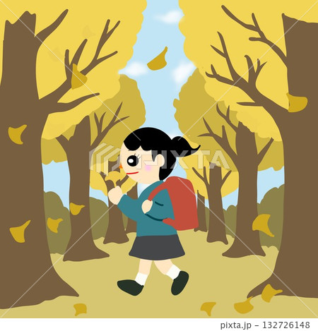 落ち葉が舞う並木道(イチョウ並木)の通学途中の学生とランドセル