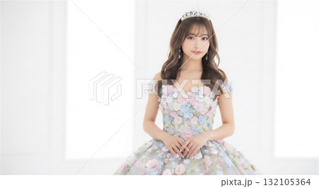 花柄ドレスとティアラを身につけた華やかな女性ポートレート