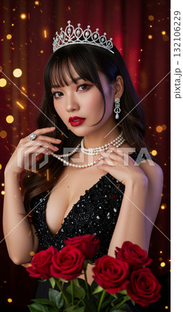 ティアラとパールネックレスを身に着けたエレガントな女性のポートレート(ブラックドレスと赤いバラ)
