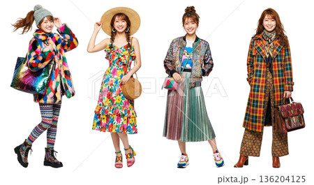 カラフルな衣装の若い女性全身4ポーズ 透過PNG 季節別の派手なカジュアルコーデ